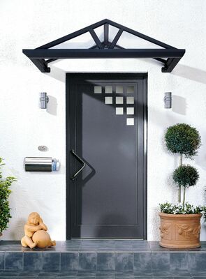 Düpmann Lieblings-Materialien sind gesetzt: Aluminium, Edelstahl, Ganzglas. Daraus haben die Düpmann-Konstrukteure eine Modellreihe von fast 50 Standard-Vordächern entworfen. Alle gängigen Formen sind hier werk- und materialgerecht umgesetzt: giebelförmig, konisch, flach, als Pyramide, als Pultdach, Pagode oder gerundet. Durch diesen Variantenreichtum bringen schon die Standard-Vordächer jede Menge Individualität ans Haus.